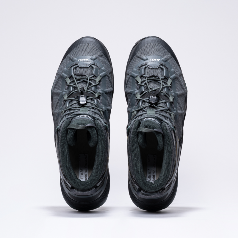 Rask tursko, dynamisk og pålitelig selv på de vanskeligste stiene. ROCKET MID DFS GTX bruker den innovative Vibram Traction Lug-teknologien som forbedrer trekkraft og grep med 25 % takket være den spesielle designen.Megagrip-blanding for bedre grep. Den eksklusive AKU Dual Fit System (DFS)-teknologien, her realisert i versjonen for speed hiking, lar deg variere graden av presisjon i passformen ved å enkelt justere de to forskjellige snøresystemene. Den er bygget med AKU Elica Natural Stride System-teknologi for å fremme biodynamisk effektivitet, hjulpet av mellomsålen i EVA med dobbel tetthet. Fotsengen er levert av Ortholite (50 % med resirkulert materiale) og er en garanti for komfort.