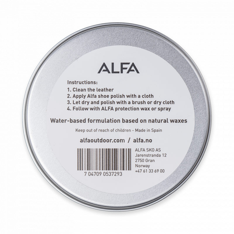 En brun skokrem som pleier. beskytter og gir fargen tilbake på sko/støvler i fullnarvet skinn. det vil si skinn med blanke overflater. ALFA Skokrem pleier. mykgjør og gir næring til skinnet. dermed forlenges levetiden på sko/støvelen. Den er vannbasert og inneholder bare naturlige ingredienser. Instrukser: Rengjør skinnet. Tilfør skokremen med en klut og smør den inn i skinnet. La det tørke og så puss over med en klut eller børste. Deretter impregneres skoen/støvelen med Alfas spray eller voks. Se våre vedlikeholdsguider for hvordan du tar vare på skoene.
