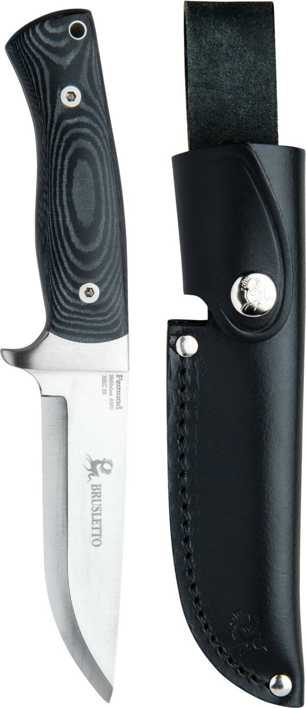 Kraftig fulltangekniv med rett slip og fingervern. Det er en jaktkniv/turkniv/fiskekniv: som har et blad med en liten drop-point profil. Micarta i skaftet.