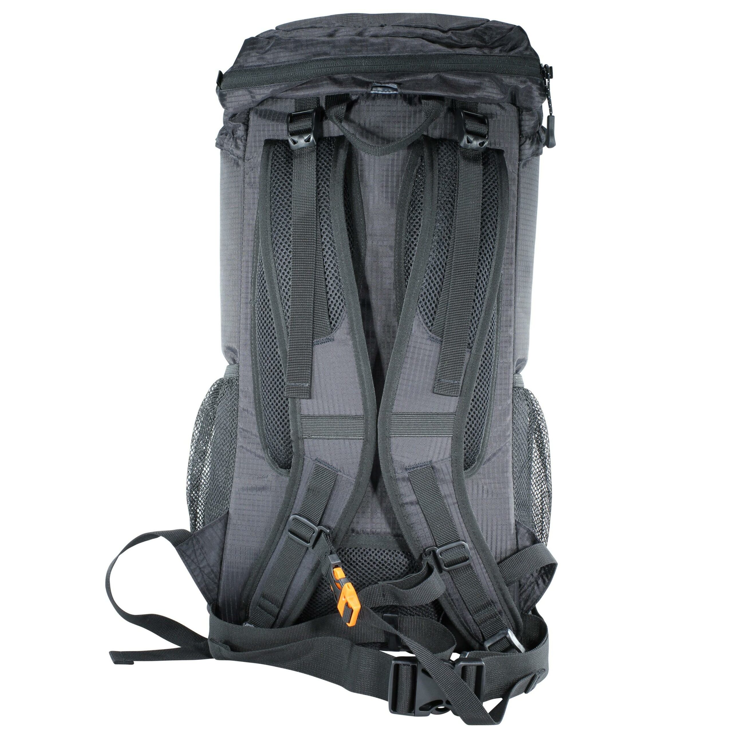 Meget lett ryggsekk. kun 630 g. Laget av slitesterk og vannavstøtende ripstop. 2 elastiske sidelommer. Refleks påsydd. Lokk m/glidelås og innvendig nøkkelholder. Innvendig lomme med 3 praktiske hemper. Justerbar brystrem med integrert fløyte. Polstrede skulderstropper og magebelte. Elastiske snorer for å feste utstyr/klær. Liten trekopp medfølger!