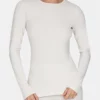 Materialet føles silkemykt og kløfritt mot huden, samtidig som det gir en naturlig balanse mellom isolasjon, pusteevne og lukthemmende egenskaper. Den ergonomiske passformen er designet spesielt for kvinner og følger kroppens bevegelser uten å begrense. Flate sømmer og forlenget rygg gir økt komfort og beskyttelse mot kulde, mens den tekniske, men stilrene utformingen gjør trøyen like funksjonell som mellomlag eller baselag.