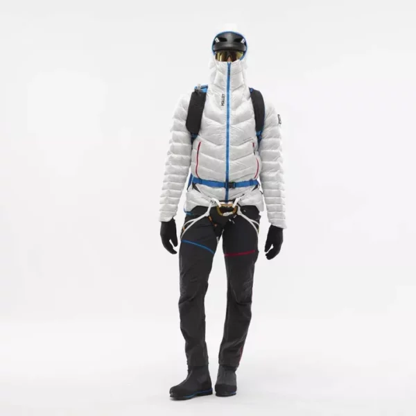Passformen er teknisk og aktiv, med hjelmkompatibel hette, justerbar linning og elastiske mansjetter for å sikre dekning og varme i alpine forhold. Jakken har to håndlommer med glidelås som er tilgjengelige selv med klatresele, og en intern lomme for trygg oppbevaring. expedition.lt+1 Vekten er oppgitt til ca. 406 gram i størrelse M, noe som understreker hvor kompakt og lett dette plagget er. Snowleader+1