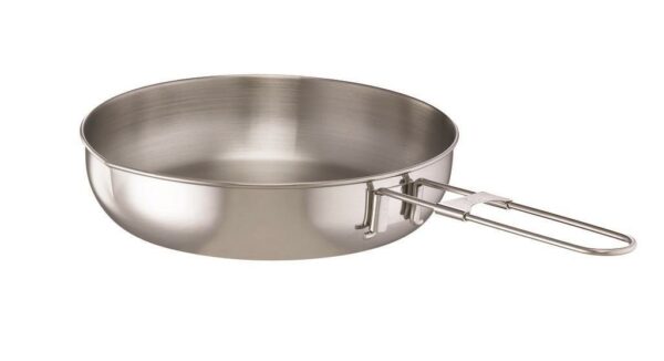 God stekepanne i rustfritt stål med håndtak som kan taes av for å spare plass.