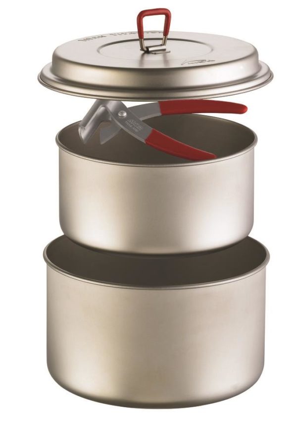 Robust kjelesett i titan med 2 kjeler på 1L og 1,5L. Kommer med ett lokk og kjelehåndtak.