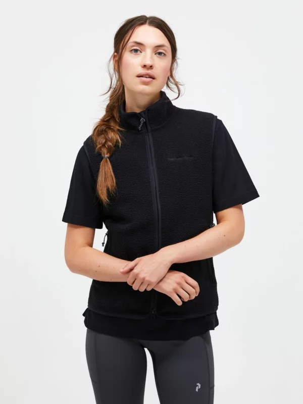 Peak Performance Womens Pile Vest er en komfortabel og stilren fleecevest utviklet for damer som ønsker et allsidig mellomlags- eller ytterplagg. Den er konstruert med et mykt pile-materiale på utsiden og en glatt jerseyfôret innside som gir behagelig følelse mot huden og enkel bruk. Den høye kragen gir ekstra dekning mot kjølig vind, og full glidelås i front samt håndlommer med glidelås sikrer praktisk funksjon og trygg oppbevaring av småting. Vesten er lett og har en normal passform som gjør den velegnet både på tur, til fritid og som del av lag-på-lag-systemet. Med elastiske kantavslutninger rundt armhuler, krage og nederkant sikres god passform og bevegelighet.