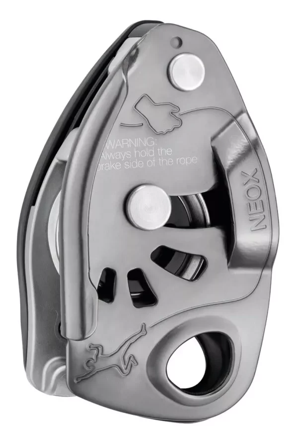 Petzl Neox er en taubrems med kam-assistert blokkering, optimalisert for led klatring, og har et integrert hjul som gjør at du raskere kan gi ut tau til klatreren.