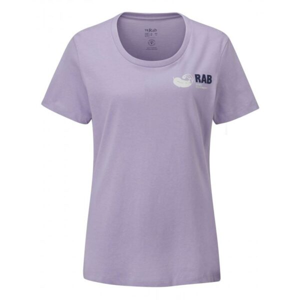 En komfortabel og supermyk t-skjorte for kvinner i organisk bomull med det klassiske Rab-logotrykket på forsiden, en vanlig passform og dyp, rund halsskjæring.