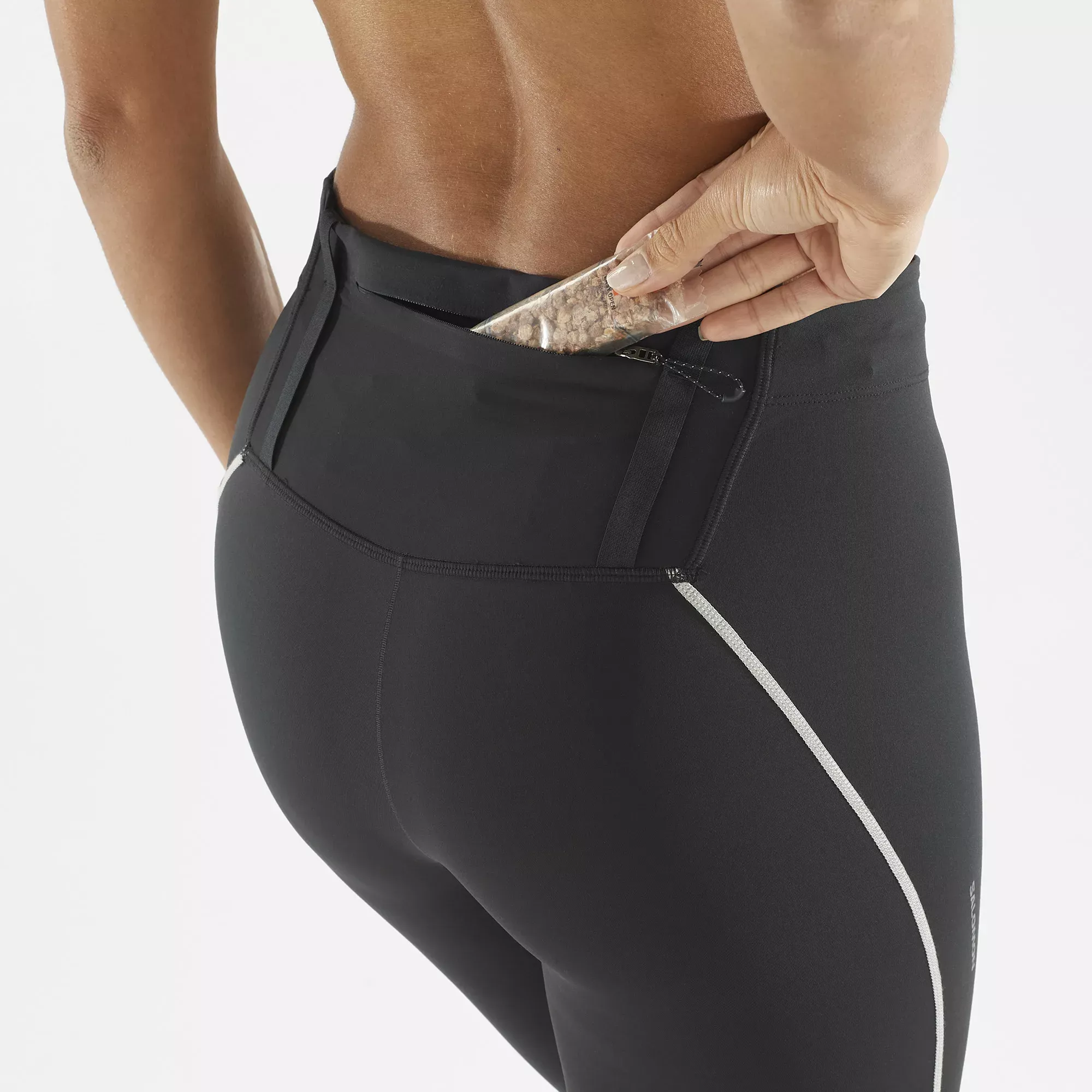Sense Stow Tights er et par løpetights laget i et ultralett, mykt vevet stretchstoff som samtidig puster og tørker fort. Med flere smarte oppbevaringsrom inkludert en baklomme for en 250 ml flaske.