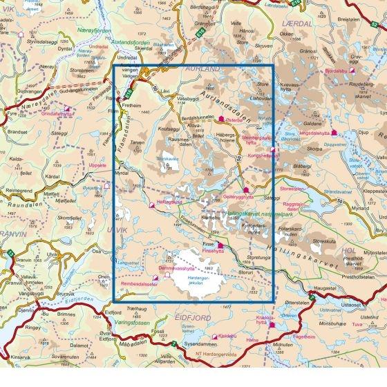 - Kartet dekker Aurlandsdalen, Finse, Flåm, Hallingskarvet og Myrdal