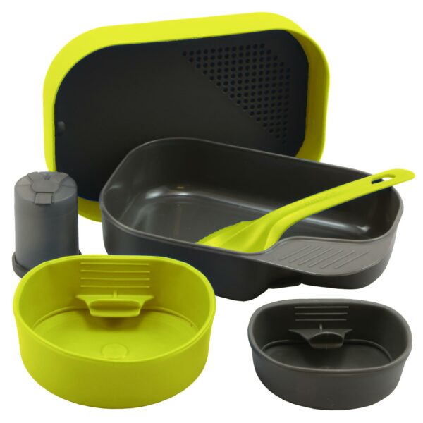 Fullt utstyrt. Inkluderer en plate med lokk, Fold-A-Cup® Big, Fold-A-Cup®, Skjærebrett, Shaker og Spork. Camp-A-Box® Complete er uten BPA